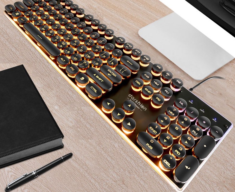 Для любителей ретро стиля, возможно, будет интересна данная клавиатура, которая копирует начертания старинной печатной машинки. Однако есть и новшества в данном дизайне, а именно светодиодная подсветка в теплых тонах. Клавиатура от продавца поставляется уже с русской раскладкой. На данный товар более 2000 продаж.