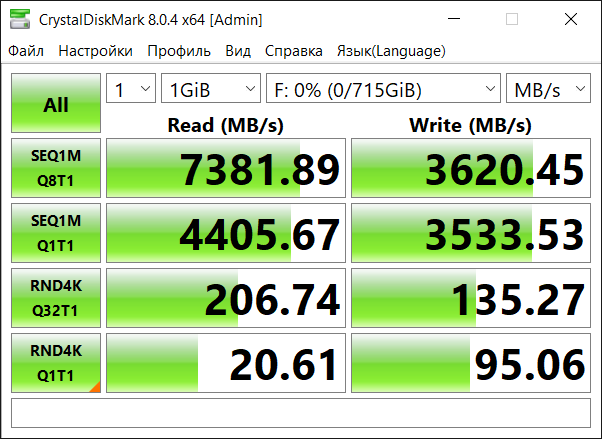 Но и с JGINYUE X79-D8 тоже ждал сюрприз. Во первых выяснилось, чтобы работали все 4 накопителя нужно использовать только ближайший слот PCE-E 16х от процессора, во втором работает только 3 накопителя, четвертого как бы нет, считает система. Но и это еще не все. Если два накопителя соединяем в софтовый RAID получает четный прирост производительности в два раза, а вот если 3 или 4, то скорость поднимается уже не более чем на 5800, хотя на двух она была вплоть до 7000. Прирост только в скорости записи, если было 2400 на двух, то 3600 на трех и 4800 на четырех… Такая вот занятная математика – больше 7 Gb/s почему-то шина выдать не может… Пока не разобрался почему, может дело в переходнике, хотя если делаешь на его базу два RAID массива то оба работают со скоростью до 7000 одновременно… Может быть позже добавлю…