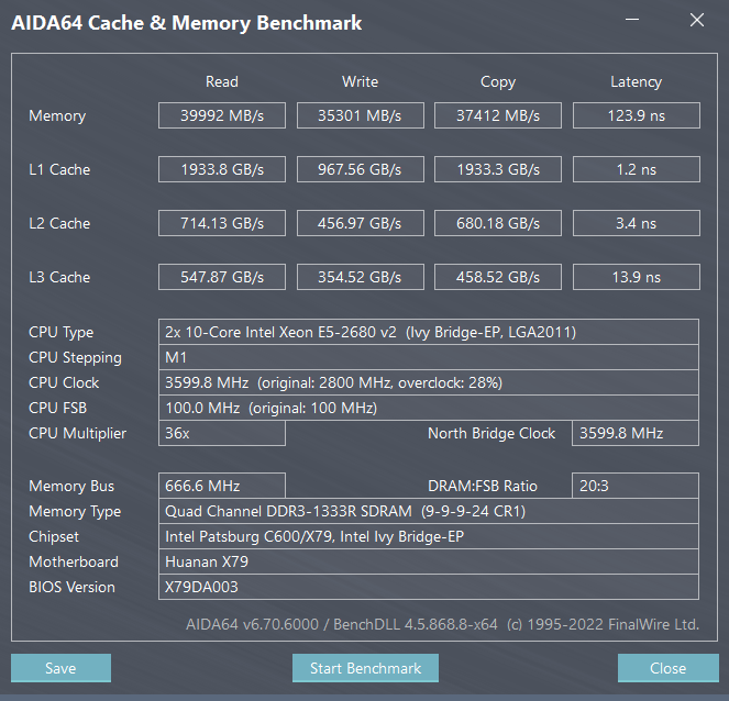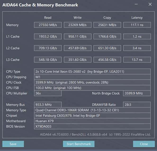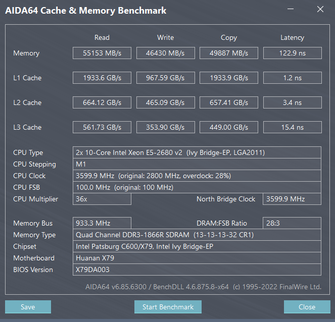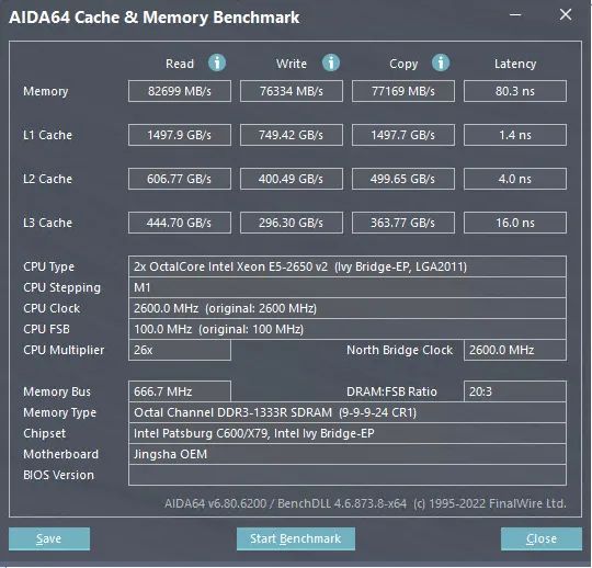 8 модулей 2х1866+2х1333-2х1866+2х1333К сожалению не могу найти замеры JINGSHA X79 S8, плату уже отдал и скрины уже не могу сделать, вот что нашел в архиве, почему-то скорость памяти 1333 и процессоры 2650v2, какой-то промежуточный вариант, но на память помню, что при использовании процессоров 2680v2 там было порядка 88000Mb/s скорость чтения при установки 8 планок на частоте 1600 (максимум что может взять эта плата), так как на плате успешно работает режим NUMA, взаимодействие с памятью соседнего процессора.