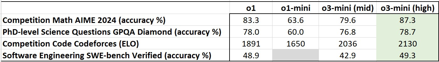 В целом, o3-mini в режимах среднего и высокого уровня рассуждений показывает лучшие результаты, чем o1-mini, в стандартных тестах ИИ, включая задачи, требующие решения проблем. В режиме высокого уровня рассуждений o3-mini даже превосходит более крупную модель o1 в некоторых тестах, хотя и уступает ей в способности обрабатывать изображения и визуальные данные.