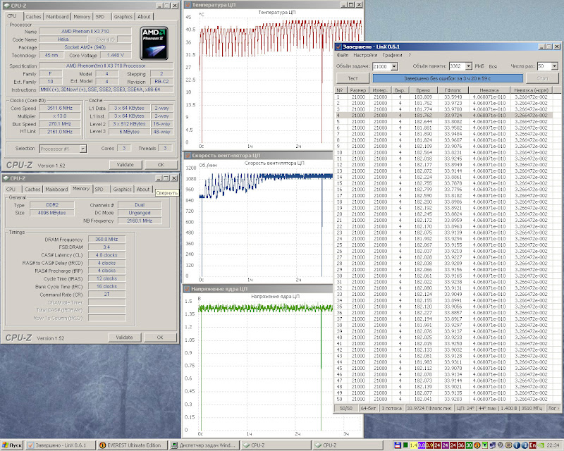 Снизил напряжение в биосе до 1.400V и обнаружил, что мать завышает напряжение на процессоре. Подумал, что надо быть аккуратнее в дальнейшем... Однако загрузился в 64бит винду и запустил linX в 64 бит режиме с размером задачи 21000