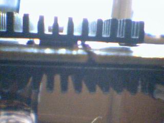 такая конструкция очень успешно справляется с отводом тепла с разогнанной карты, но тепловыделение было все равно приличным – грелась плата с обратной стороны ядра. А хотелось гнать и гнать! Тогда я взял оставшуюся часть радиатора и приклеил на плату с обратной стороны, напротив ядра. Проблема оказалась в том, что там размещались элементы поверхностного монтажа, оставляя свободным небольшой квадратик напротив ядра. Я приклеил радиатор через небольшую металлическую пластину, подняв его таким образом. На снимке видно получившийся зазор.