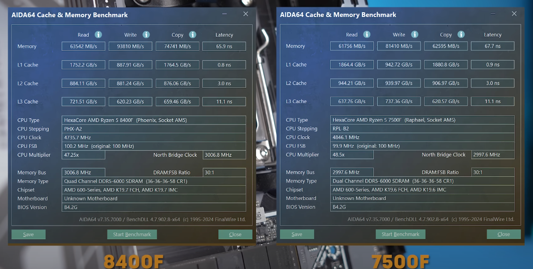 Но вот Ryzen 8400F — зверь диковинный. Фактически это отбраковка от шести ядерного Ryzen 8600G с мощным встроенным графическим чипом 760M (в 8400F чип отключен), а значит, на поверку это все плюсы и минусы монолитного EPU. В плюс — это один общий кристалл, который отлично бустит работу с оперативной памятью на не очень дорогой DDR5 6000 с 36 таймингами. Чтение и копирование в память у 8400F на 10-15% выше, чем у 7500F, и на пару наносекунд ниже задержка.
