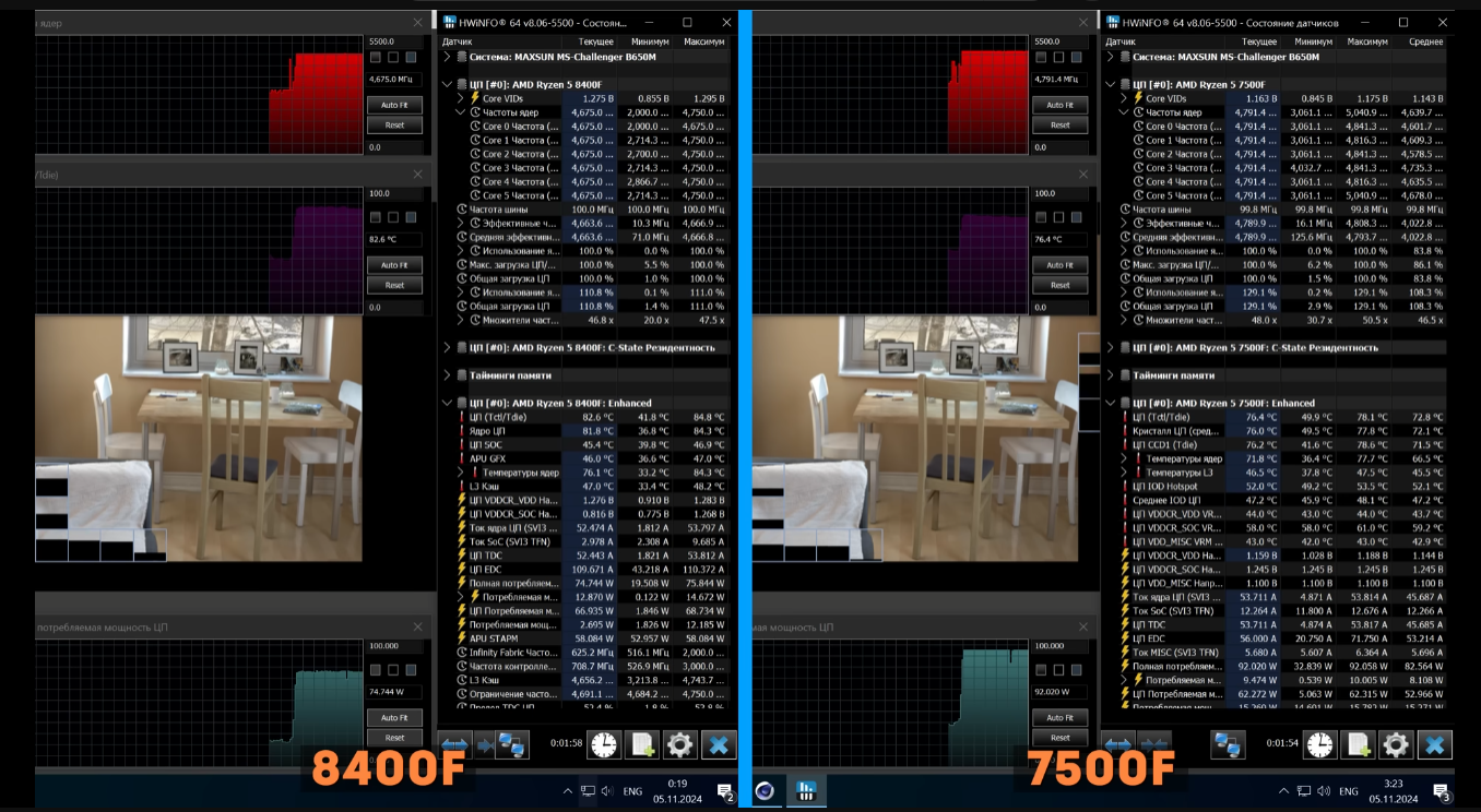 В Cinebench R23 оба чипа не смогли удержать максимальную частоту, но если 8400F провалился на 25 МГц, то 7500F — на все 200 МГц. К тому же 7500F потребляет больше 90 ватт, а монолитный чип 8400F всего 75 ватт. Это значит, что этот процессор заведется и будет работать на самых дешевых материнских платах с A620, на которых 7500F доводил VRM до 100°C.
