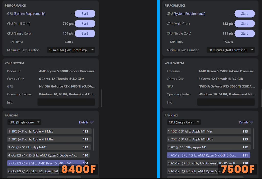 Смотрим, на сколько 7500F окажется быстрее в Performance R24. Разница между процессорами немного больше, около девяти процентов, за счет более высокой частоты 7500F.