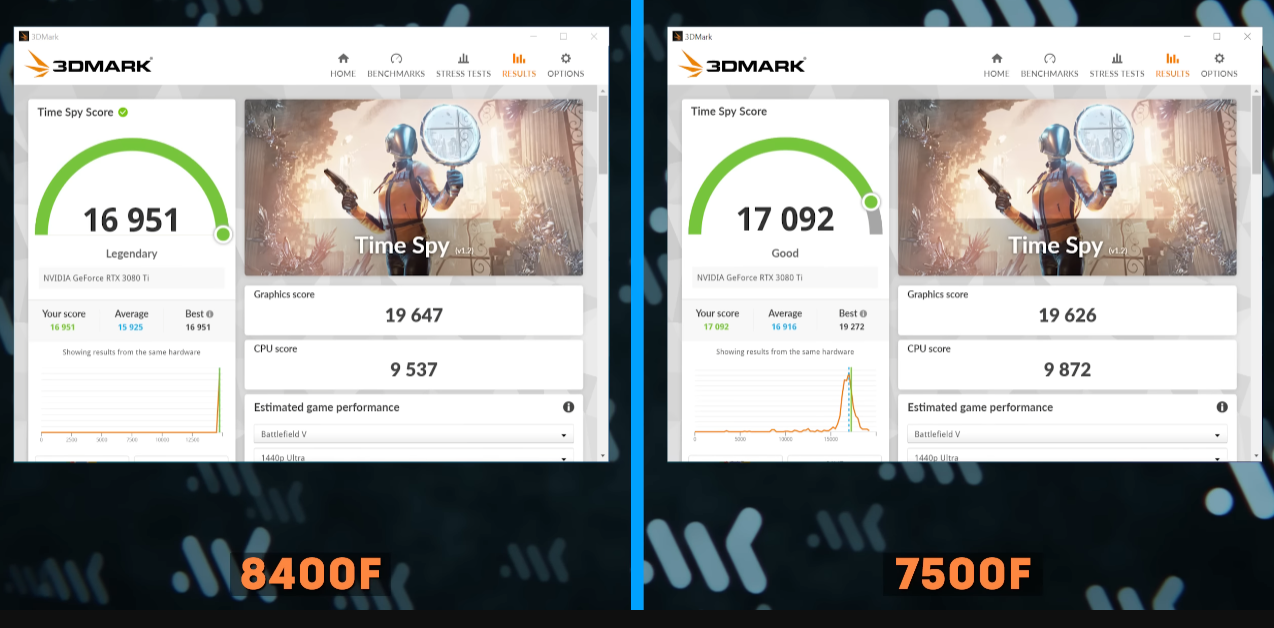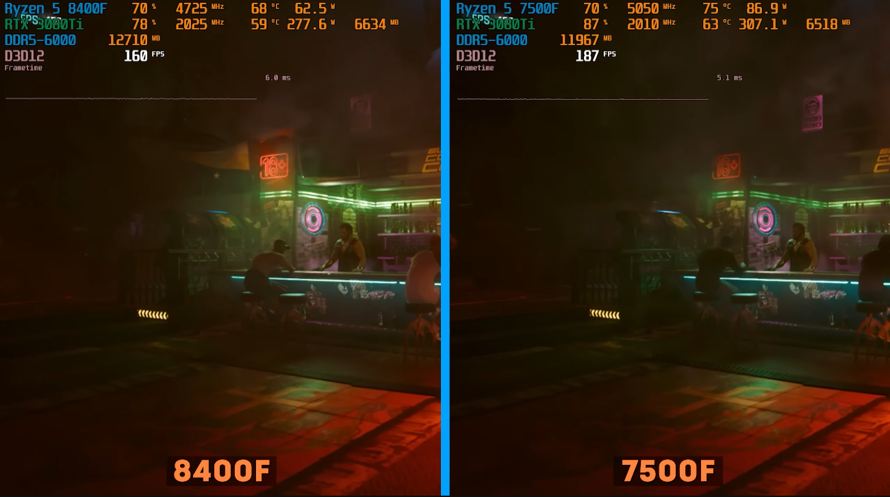 А вот Киберпанк к 8400F настроен менее оптимистично: FulHD с ультра настройками графики и минимальной трассировкой при включении DLSS на ультра производительность. 7500F смог отрисовать 180 кадров, обогнав 8400F сразу на пятнадцать процентов, правда, ценой потребления, которое почти на 40 процентов выше. Все-таки чиплетам далеко до монолитов по энергоэффективности. Если отключить DLSS, то упор будет в 3080Ti, а не в процессоры.