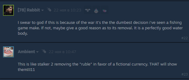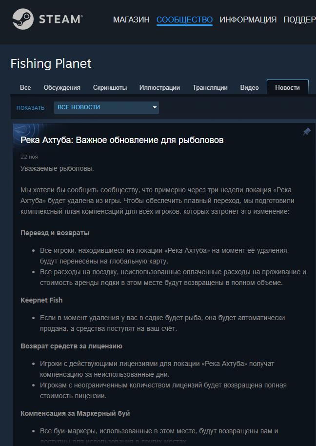 Всем кто купил безлимитный пропуск на вылов рыбы - лицензию , а она к стати не дешевая порядка 1500 золота, обещают вернуть. Но главное ресурсы потраченные на эту локацию, платный набор экипировки который то же не дешевый, каждый набор под локацию или под праздник стоит как полноценная игра в стиме. Короче - на зло кондуктору пойду пешком и уши отморожу. На какие бабки попадут разрабы история умалчивает, да и не больно интересно это. Может следом и речку Селенгу удалят всем назло и себе в первую очередь. Сама игрушка так себе, посредственная, я в нее играл в "ковид" пока все дома сидели, она онлайн, можно пока рыбачишь общаться через дискорт с товарищами и да же вместе рыбачить, если находишься на одной локации. Короче помогла немного время "ковидное" скоротать в общении с приятелями.
