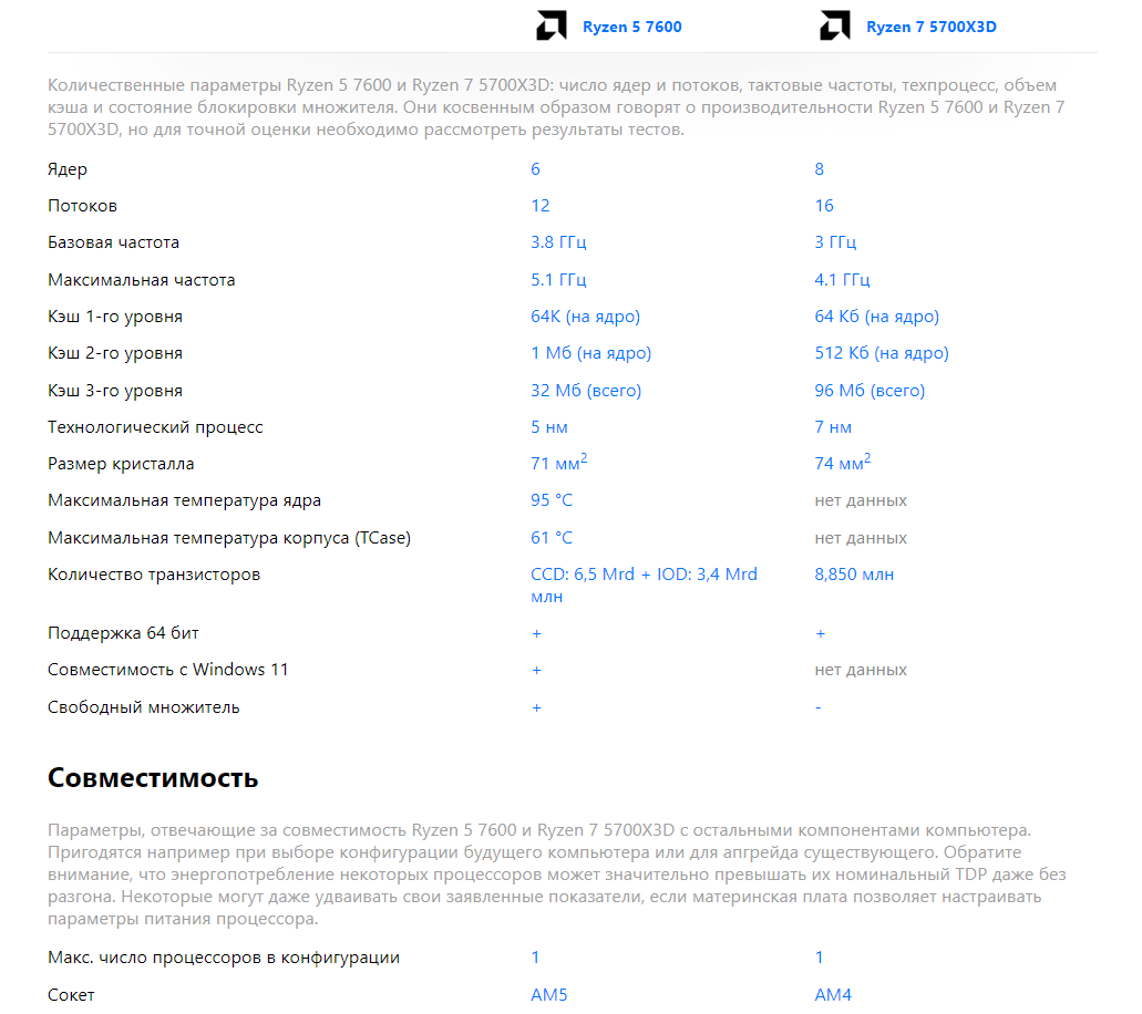 AMD в прошлом году расширила свою линейку процессоров для настольных ПК Ryzen 7000 «Zen 4» тремя новыми доступными моделями, которые призваны составить конкуренцию расширенной серии Intel 13-го поколения «Raptor Lake» мощностью 65 Вт и AMD Ryzen 5 7600 один из самых доступных процессоров этой линейки сделан на 5 нанометрах, в отличии от предидущего процессора. Он так же имеет шесть ядер и двенадцать потоков с частотой на все ядра 3.800Ггц в бусте на ядро 5.100Ггц. И да, процессор имеет разблокированный множитель и гонится не только по шине, как в первом случае с 5700X3D. Кроме этого, на борту присутствует интегрированная графика, что не маловажно для многих пользователей и для моего соседа тоже ( - А вдруг видяха сдохнет, так можно будет в танчики поиграть). Поэтому выбор пал именно на этот процессор. И в заключении этот процессор не сильно уступает своему старшему собрату Ryzen 5 7600X, если равняться на тесты игр, то потеря находиться в погрешности 5-10 FPS, а цена на четыре тысячи дешевле.