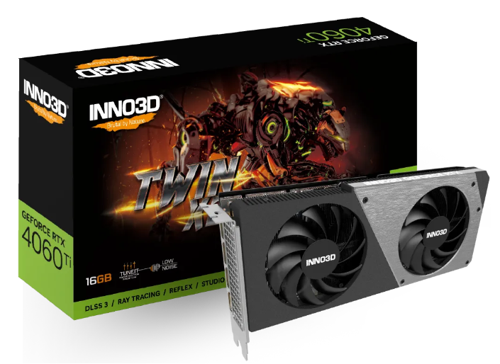 Inno3D GeForce RTX4060 Ti 16GB TWIN X2 OC, 16G GDDR6 с шиной 128-bit и штатной частотой 2310 МГц ,а в разгоне 2565Мгц. Ценой 57000 рублей.