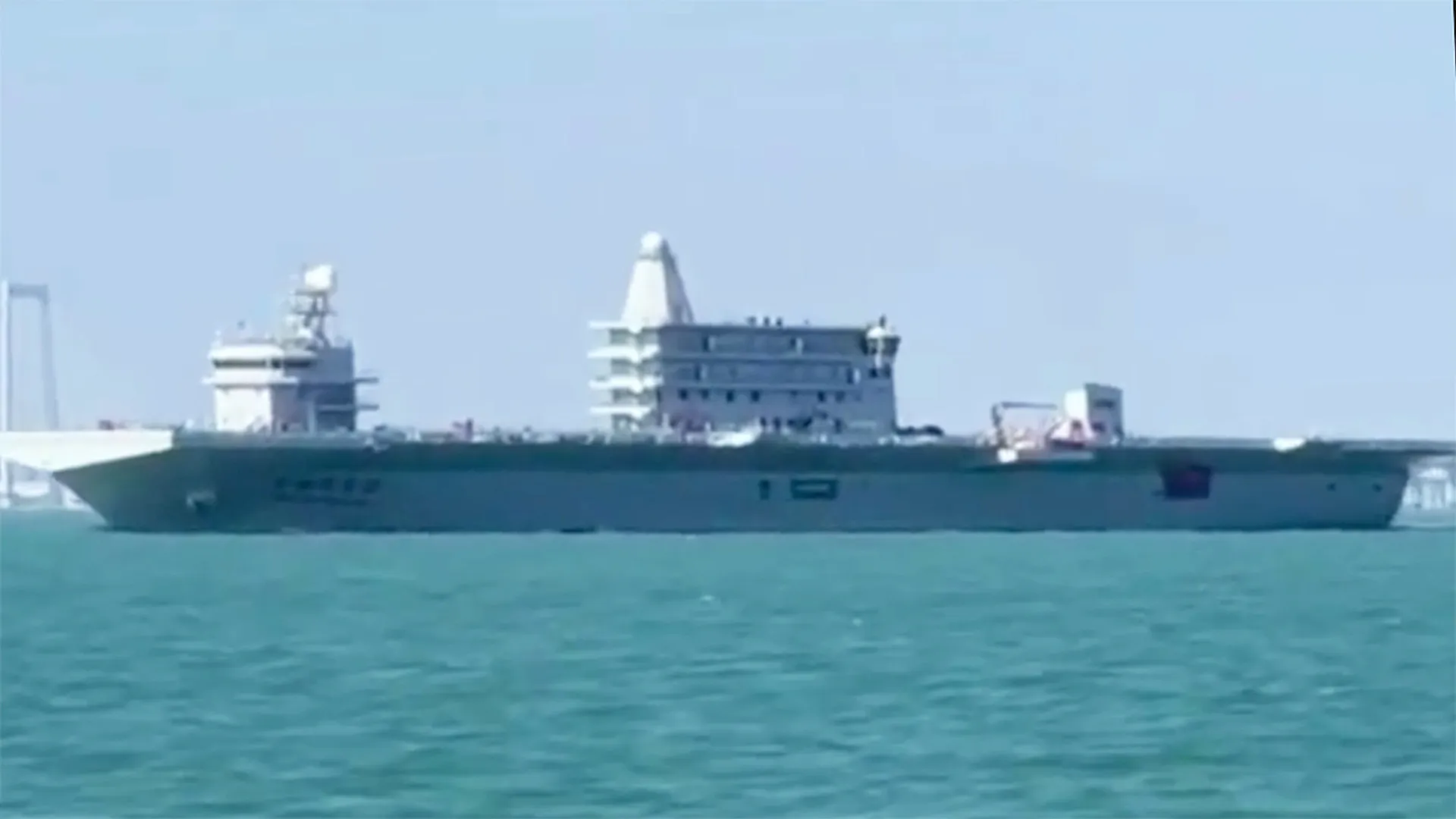 Снаружи палуба корабля плоская, как у десантного корабля типа 075. Если увеличить масштаб и присмотреться, то можно увидеть, что на корабле есть три больших надстройки, все они расположены по правому борту полетной палубы. Надстройка посередине самая высокая и имеет сферическую оболочку антенны наверху. Надстройка на носу меньше, с традиционным мостиком и традиционной мачтой наверху. Третья надстройка на корме самая маленькая и содержит ряд выхлопных труб.