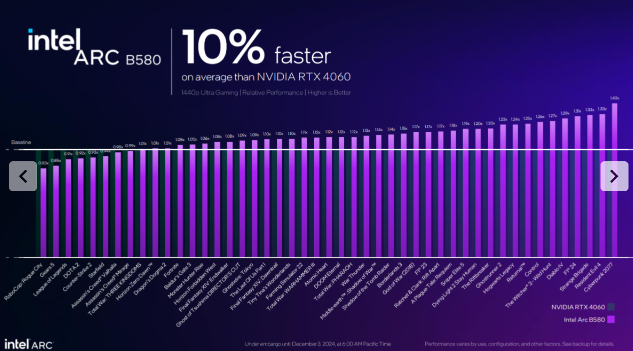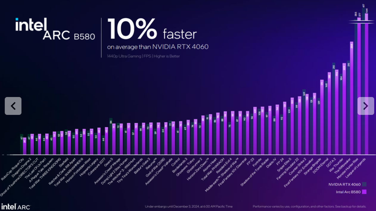 Согласно внутренним тестам Intel перед выпуском (см. ниже), Arc B580 в среднем на 10% быстрее, чем RTX 4060 от Nvidia при разрешении 1440p. Это вполне правдоподобно, в зависимости от выбранных игр, но в наших собственных тестах, в которых участвовали игры, отсутствующие в выборке Intel, результаты были гораздо ближе к этим.