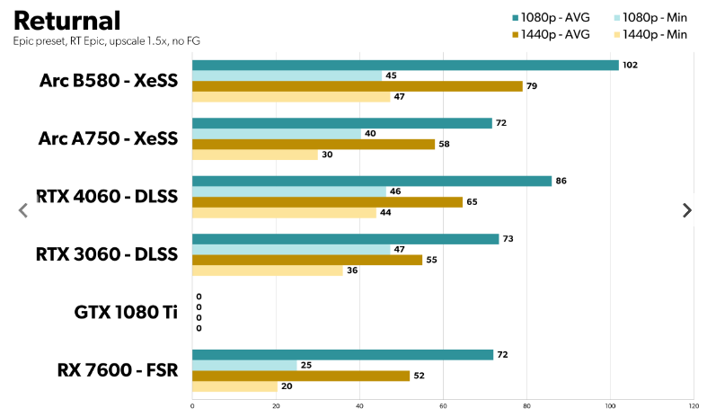 Аппаратное обеспечение Intel для трассировки лучей второго поколения, которое улучшило ключевые технические аспекты в 1,5–2 раза по сравнению с дебютными картами Arc, просто потрясающее. Трассировка лучей уже была сильной стороной Arc первого поколения, а усовершенствования трассировки лучей в архитектуре Xe 2 позволили графическому процессору Intel значительно опередить хваленую трассировку лучей Nvidia в Cyberpunk и Returnal. В Watch Dogs Legion с трассировкой лучей на высоких настройках производительность немного снизилась, но конфигурация памяти B580 помогла ему опередить конкурента на 7,5% при разрешении 1440p.