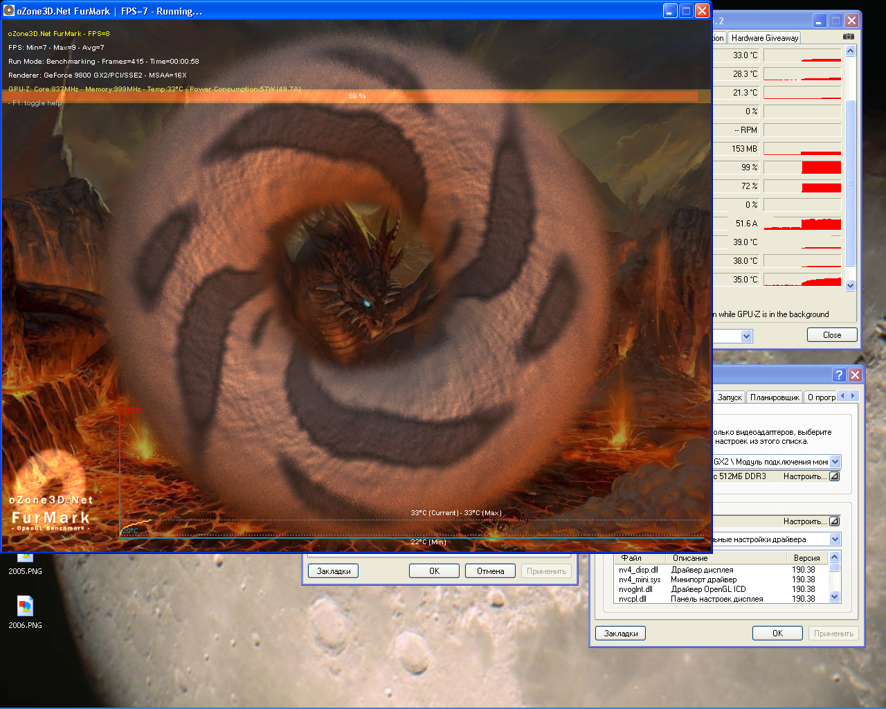 ну и фукрмарк на полный ход, как видно за 1 минуту гпу прогревается с 10*С до 33*С, а мосфеты с 5-6 до 40*С с таким раскладом поднимать напряжение ну очень не хочется.