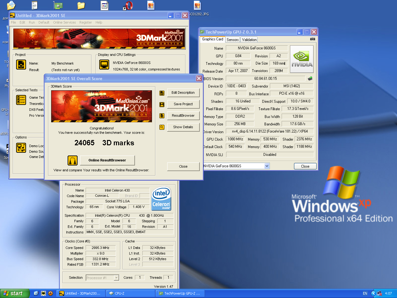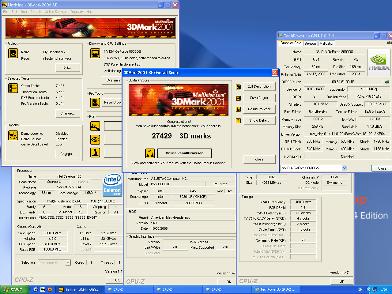 для меня был спортивный интерес прогнать марк 2001 при разгоне 8600GS на 100%, почему-то всё время не получалось покорить рубеж 900/1980/500, но вдруг ни с того ни с сего прохожу марк на этих частотах при напряжении 1,385В! это почти штатное (1,35В) я понял в чём причина, зеркальная поверхность радиатора, под неслабым давлением пружин, со временем вытеснила лишнюю пасту КПТ-8 и тем самым улучшила теплоотвод, с каждым днём карточка робила лучше и лучше. и вот я решил провести очередную попытку и чесно говоря был сильно разочарован.