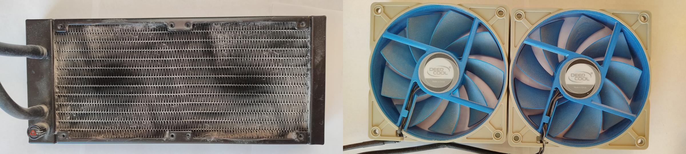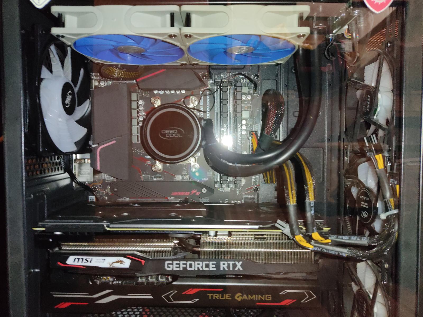 Все это дело собрал, сбросил биос снятием батарейки (можно было просто замкнуть 2 контакта), сменил вентилятор на выдув в корпусе на вентилятор с красной подсветкой, который шел в комплекте с СЖО. А причины их снятия с СЖО проста: во-первых, они низкого качества производства, во-вторых, на высоких оборотах они гудели как турбины авиадвигателя! Купил взамен штатных 120 вентиляторов, 120 вентиляторы на 2-х шарикоподшипниках от компании DEEPCOOL UF1 (без подсветки). Они обдувают радиатор СЖО отлично и практически бесшумно! Так что в этой СЖО 2 минуса: стоковые вертушки воют на высоких оборотах, плохая полировка медного основания помпы. При покупке имейте в виду. На видеокарте пыль была только на верхней алюминиевой крышке. Плашки памяти были в незначительном тонком слое пыли. Старый винчестер продул пылесосом. Вот что получилось: