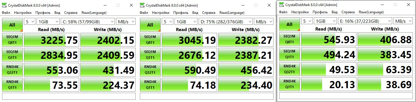 DiskMark64: SSD 512 Гбайт, A-Data XPG GAMMIX S11 Pro размечен на логические диски С и D: соответственно и разный объем, разные значения и SSD 240 Гбайт WD green (один логический раздел)