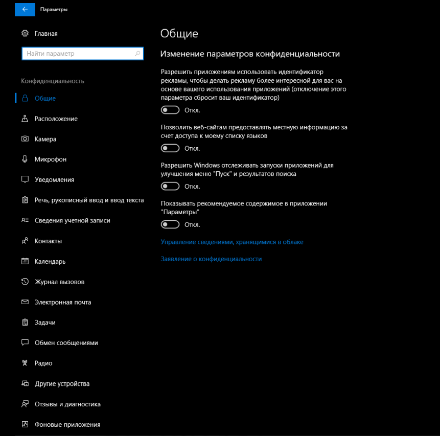 Здесь Вы сами можете выбрать что можно отключить, а что не нужно, по Вашему мнению. Но разработчики не были бы сами собой, если не всунули в систему помимо этих параметров конфиденциальности еще кучу всех премудростей.
