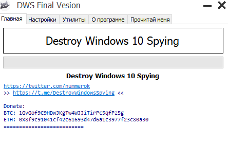 Вторая программа: Destroy Windows 10 Spying.