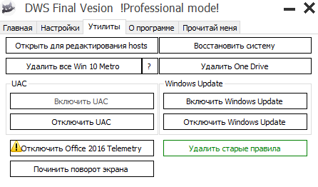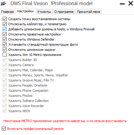 Она позволяет удалить встроенные в Windows 10 Metro приложения, а также удалить телеметрию, добавив в host файл Windows адреса серверов MicroSoft, куда поступает вся информация с Вашего компьютера (при условии, что host файл не заблокирован антивирусом для изменений).