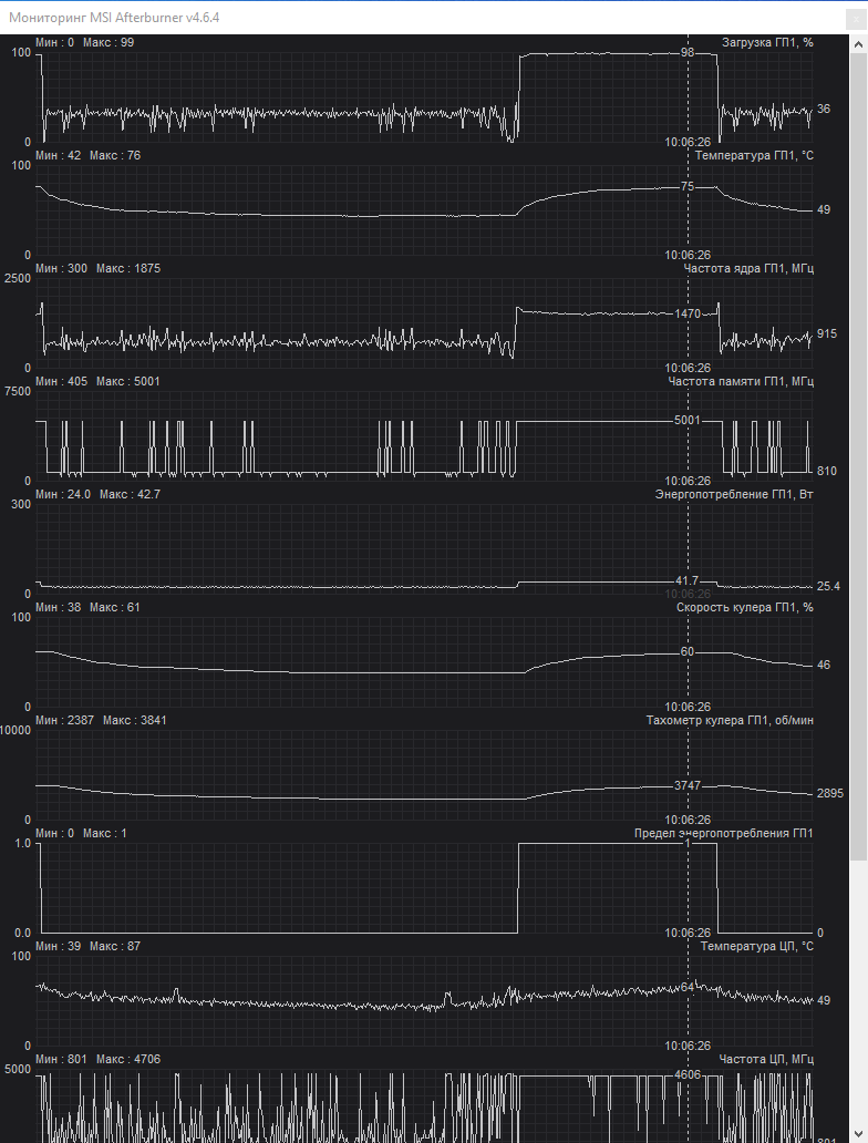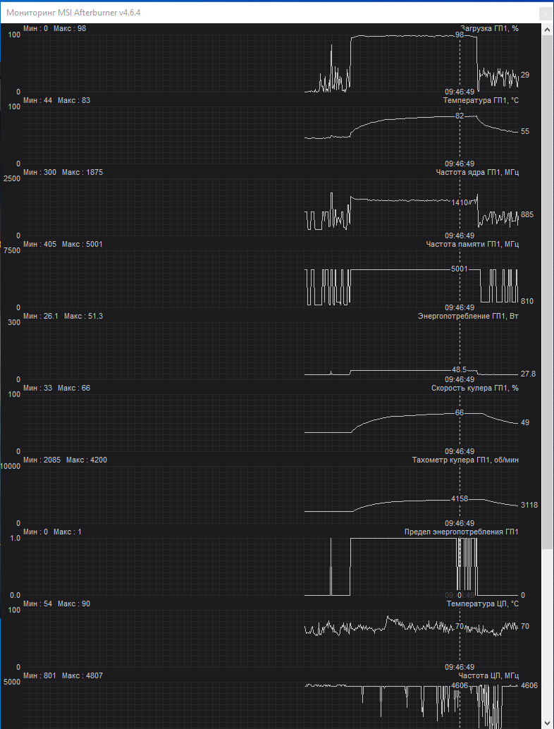 Ниже можно разглядеть частоты и температуры во время бенчмарка на протестированных картах