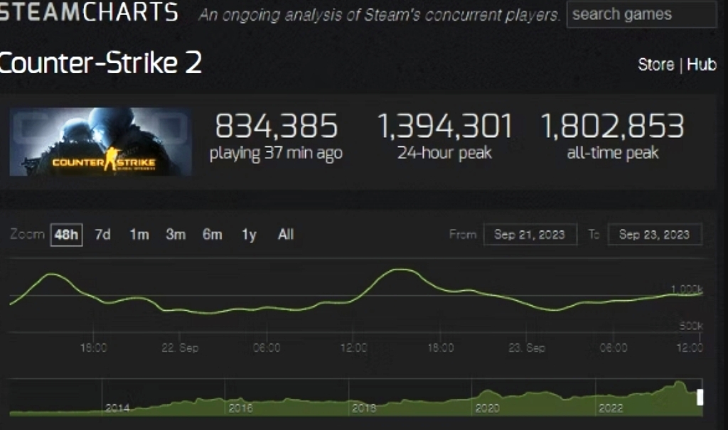 По данным Steamcharts, Counter-Strike 2 достигла пика в 1 394 301 одновременных игроков в 28 сентября 2023 года в 18:00 с 852 393 игроками в игре в 11:00. Рекрод еще не побит т.к. это на 150 тыс. от пикового показателя в 1 556 326 2 сентября после фактического выпуска открытой бета-версии, но это может быть связано с тем, что компания Valve исчерпала возможности своих серверов в некоторых регионах. Поскольку нет серверов сообщества, к которым можно было бы обратиться, все играют на серверах Valve, и оказывается, что им не хватает ресурсов, чтобы справиться с тем количеством людей, которые хотят играть в Counter-Strike 2.