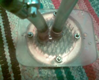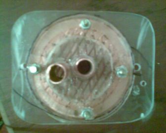 2.Я сделал прорезы и высверлил четыре дырки по боках для прижатия остальных деталнй. Как видно на фото внизу с лева 2 дырки, дело в том что медный кусок толстый 3см и при его сферлении я сломал 4 свердла, и одно из них осталось в дырке . Но это не проблема я ее залью герметиком