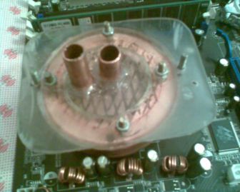 Через центральный штуцер поступает жидкость, которая проходит межде ребрами заберая у них тепло потом доходит до контура и выходит через отверстия в верхнюю камеру где собераясь в одно целое выходит через боковой штуцер. Эта технология позволяет добиться отмывания жидкостью всей поверхности ватерблока.