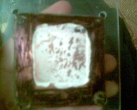 Вот оно вся суть и выяснилась, почему большинство процессоров класса е2160 по непонятным причинам за пару секунд при определённом разгоне с выше 3 гигагерц и поднятым питанием около 1.45-1.50 вольта всего через пару минут нагреваются при прогоне разных нагрузочных утилит по показаниям утилиты Core Temp с использованием суперкуллера Zalman 9700 Led с выше 70 градусов по цельсию. А ответ прост потому, что у таких процессоров крышки почти все кривые или с вмятинами в середине что я и продемонстрирую на данном рисунке, где термопаста КПТ-8 то большим, то меньшим слоем выделяется на теплообменнике.