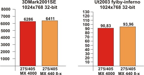 Для большей наглядности возможностей MX 4000 я решил сравнить результаты тестов с Inno3D GeForce 4 MX 440 8-х(память Elixir 5 ns 128-bit), тестировавшейся на том же стенде.