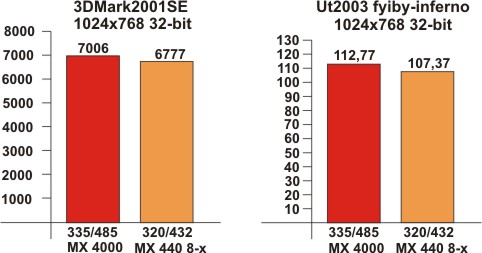 Результаты разгона порадовали меня гораздо меньше. Все, что удалось выжать до появления артефактов из MX 4000 – это 335/485, а из GeForce 4 MX 440 8-x – вообще 320/432. Память на GeForce 4 MX 440 8-x - Elixir 5 ns практически полностью не поддалась разгону, что немало огорчило.
