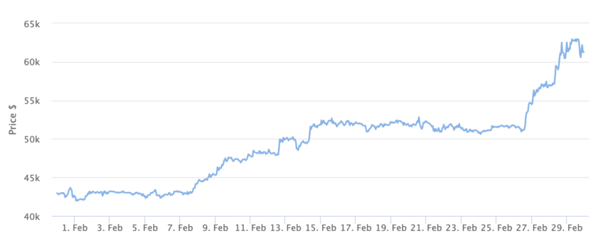 Согласно недавнему отчету Bloomberg, оба банка намерены начать предлагать продукт на фоне того, что цена биткоина достигла исторического максимума. Это произошло после того, как BeInCrypto сообщила, что девять из недавно запущенных спотовых биткоин-ETF достигли рекордных объемов. На момент публикации биткоин оценивается в $61 259. Это на 19,37% больше, чем за последнюю неделю, и примерно на 42% за последние 30 дней.