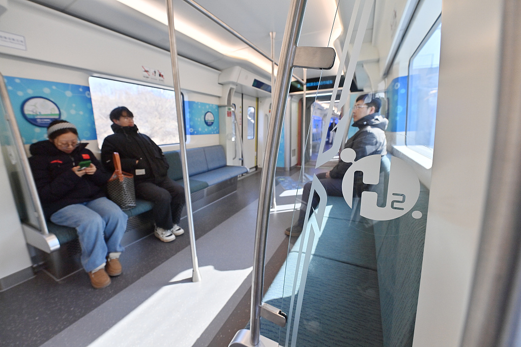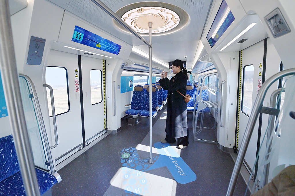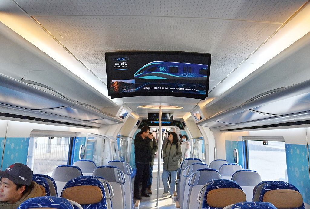 Пассажиры едут на междугороднем поезде с водородным двигателем в Чанчуне, провинция Цзилинь на северо-востоке Китая, 21 марта 2024 года. [Фото/VCG]