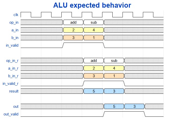 Как видите, это АЛУ очень простое. Он имеет две ступени регистра, без задержек и поддерживает только две операции: сложение и вычитание. Вот пример сигнала того, как мы ожидаем, что ALU будет вести себя: