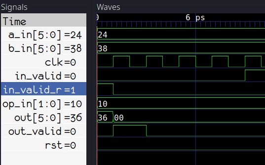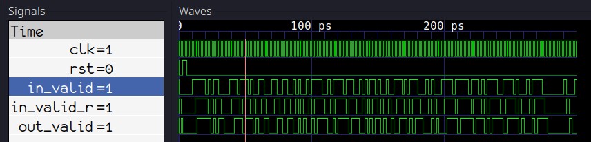 Таким образом, если мы применили 1 к in_valid на 5-м положительном фронте тактов, мы должны увидеть 1 на out_valid после двух тактов, или, другими словами, на 7-м положительном фронте тактов. Вот как мы это проверяем: