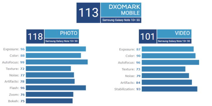 После тестирования смартфона специалистами, DxOMark вынес устройству 118 баллов в фото. Широкий динамический диапазон, экспозиция, система автофокуса и работа вспышек также вносят значительный вклад в общую оценку фотографий Galaxy Note 10+.
