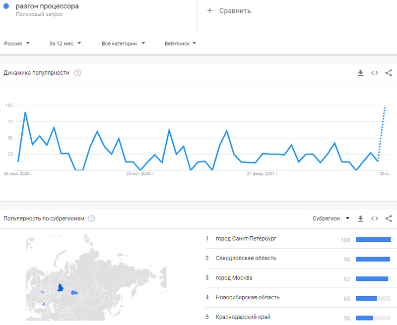 Скажу сразу – не густо, гоняют только Москва, Питер и весь Краснодарский край. Возможно написание латиницей данного явления не пользуется особой популярность. Изменим запрос на «Разгон процессора».