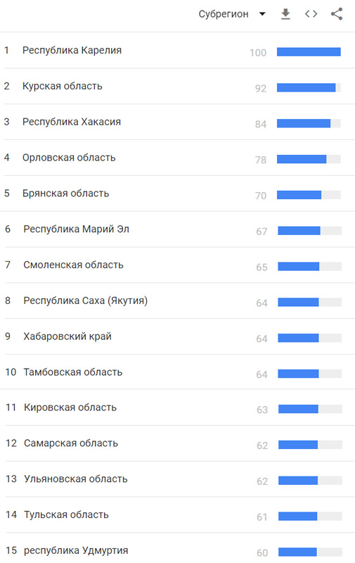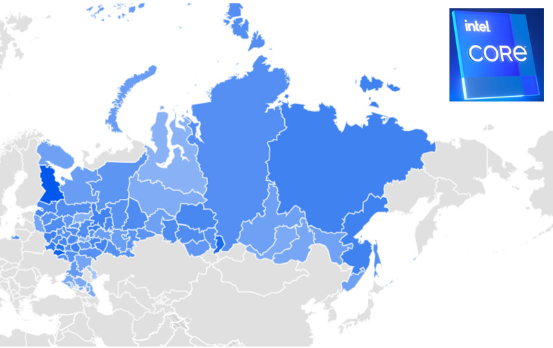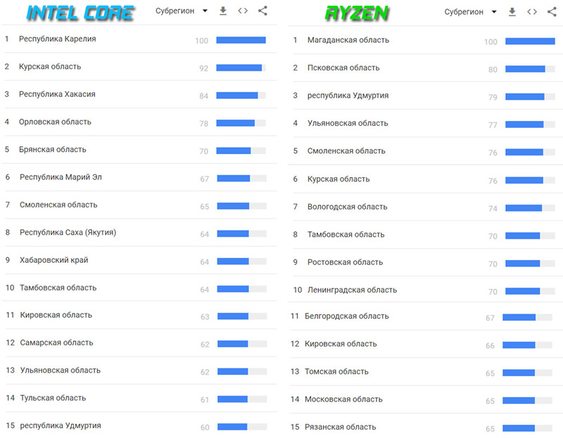 Посмотрим теперь по любителям RYZEN и INTEL CORE, где по регионам больше всего интересуются данными марками, а раз интересуются, значит что, возможно и приобретут. Начнем с Intel Core.