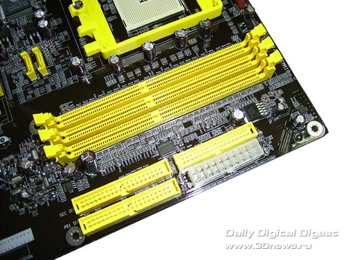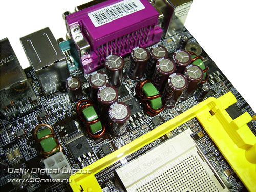 Для сравнения приведу фотку цепи питания DFI Lan Party на том же чипсете, которая славится отличным разгоном (информация взята с сайта 3D News):