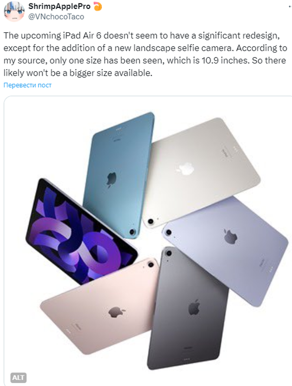 По всей видимости, предстоящий планшет от компании Apple - IPad Air 6 получит небольшое изменение в дизайне. Речь идет об обновленной фронтальной камере, которая станет альбомной. Пока что это только лишь слух, а значит вероятность не стопроцентная. Данной информацией поделился инсайдер ShrimpApplePro в соцсети X.