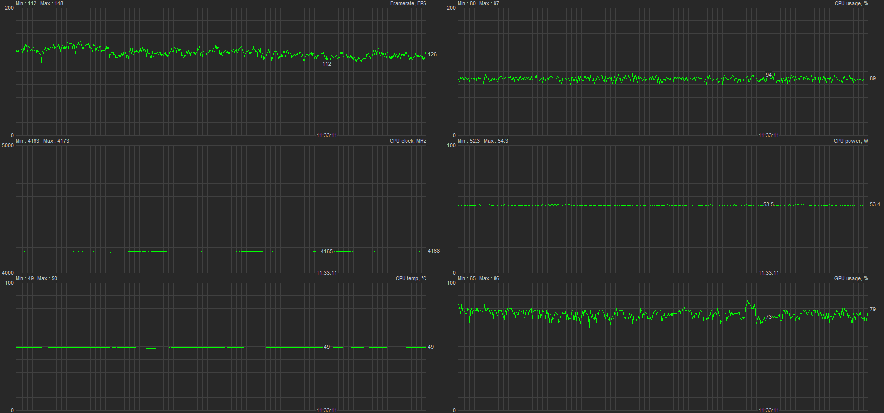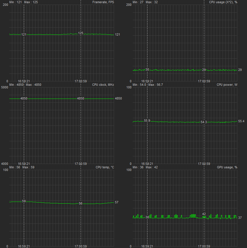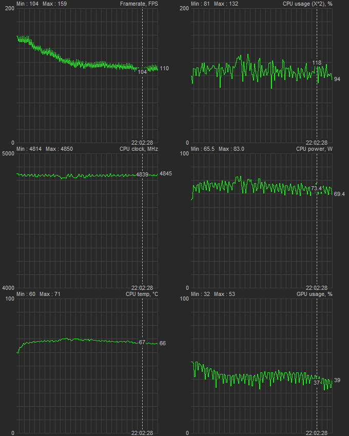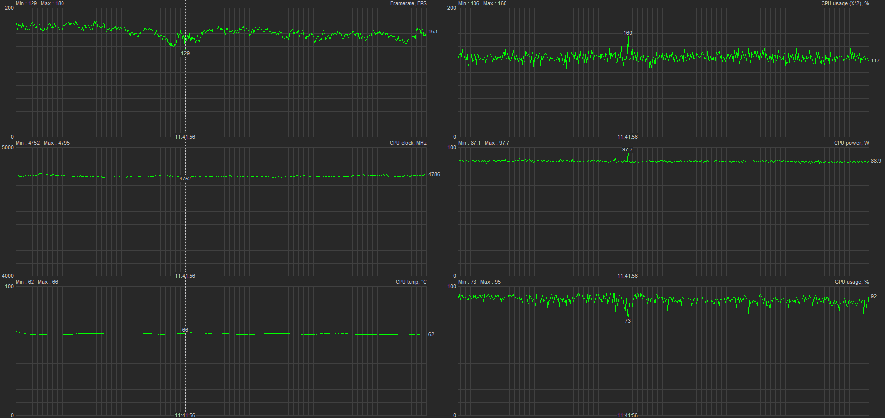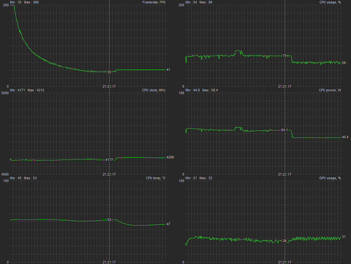 Настройки почти аналогичны тем, что я использую во время обычной игры. Ограничение кадров на всякий случай поднято с 200 до 300. Чтобы максимально загрузить процессор, включена настройка Future frame rendering. Посмотрите в таблице ниже на график GPU usage для конфигурации "5800x 8". Видите маленькие "полочки"? Это идёт упор в видеокарту, потому что с приведённым настройками игра больше, чем на 95%, её загрузить не может. Снижение разрешения с 1600x900 до 1280x720 повлияло на загрузку видеокарты на удивление слабо, поэтому снижать дальше не имеет смысла.