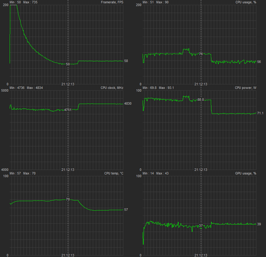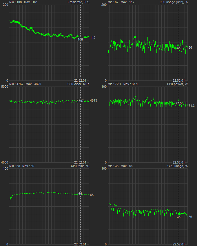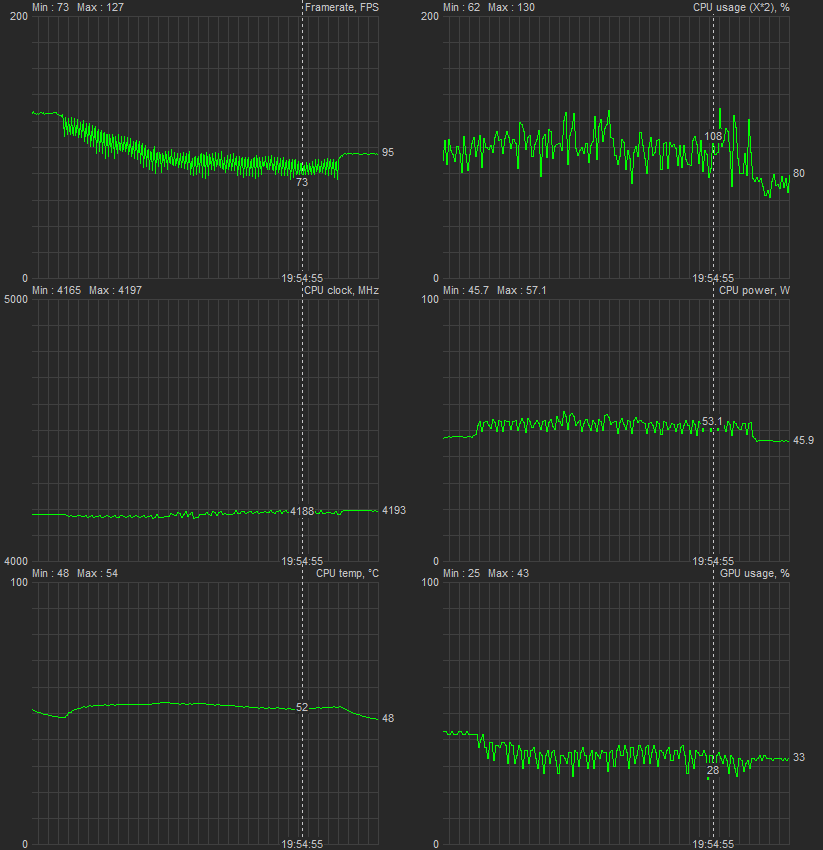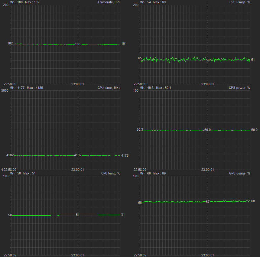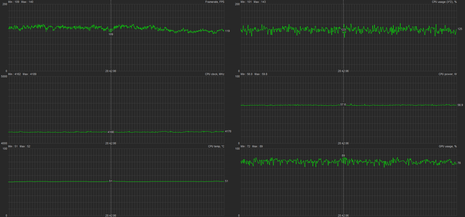 Настройки почти аналогичны тем, что я использую во время обычной игры. Ограничение кадров на всякий случай поднято с 200 до 300. Чтобы максимально загрузить процессор, включена настройка Future frame rendering. Посмотрите в таблице ниже на график GPU usage для конфигурации "5800x 8". Видите маленькие "полочки"? Это идёт упор в видеокарту, потому что с приведённым настройками игра больше, чем на 95%, её загрузить не может. Снижение разрешения с 1600x900 до 1280x720 повлияло на загрузку видеокарты на удивление слабо, поэтому снижать дальше не имеет смысла.