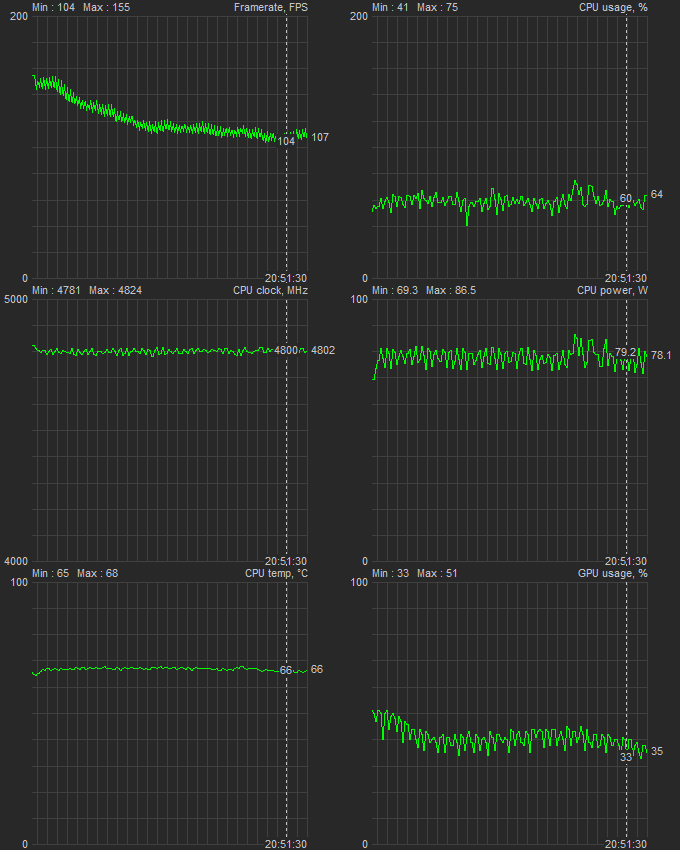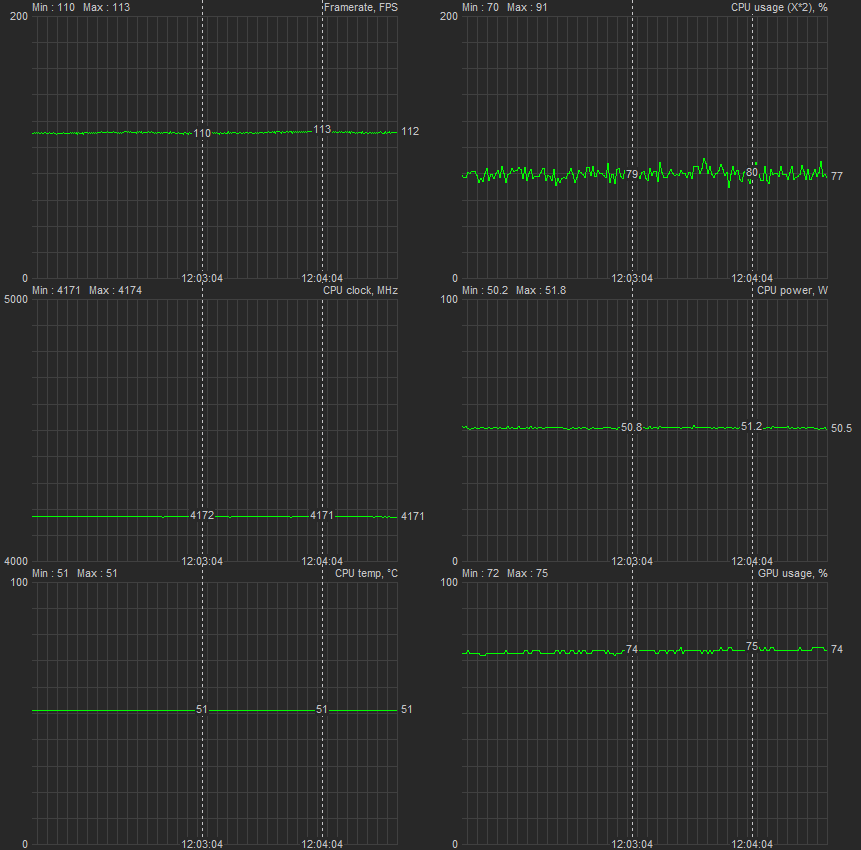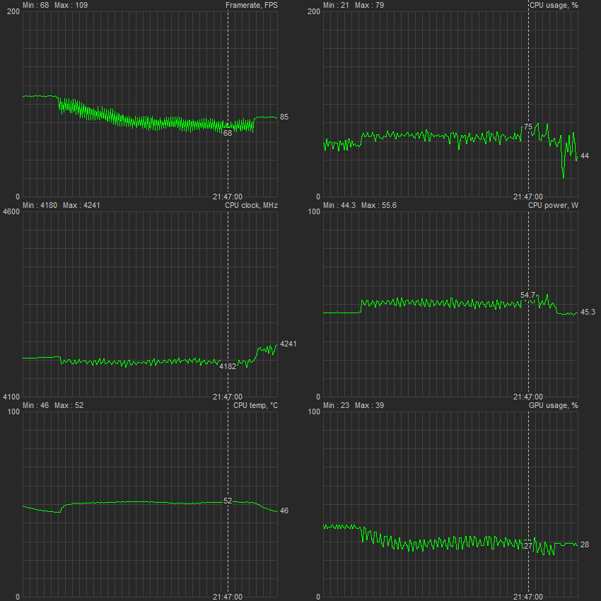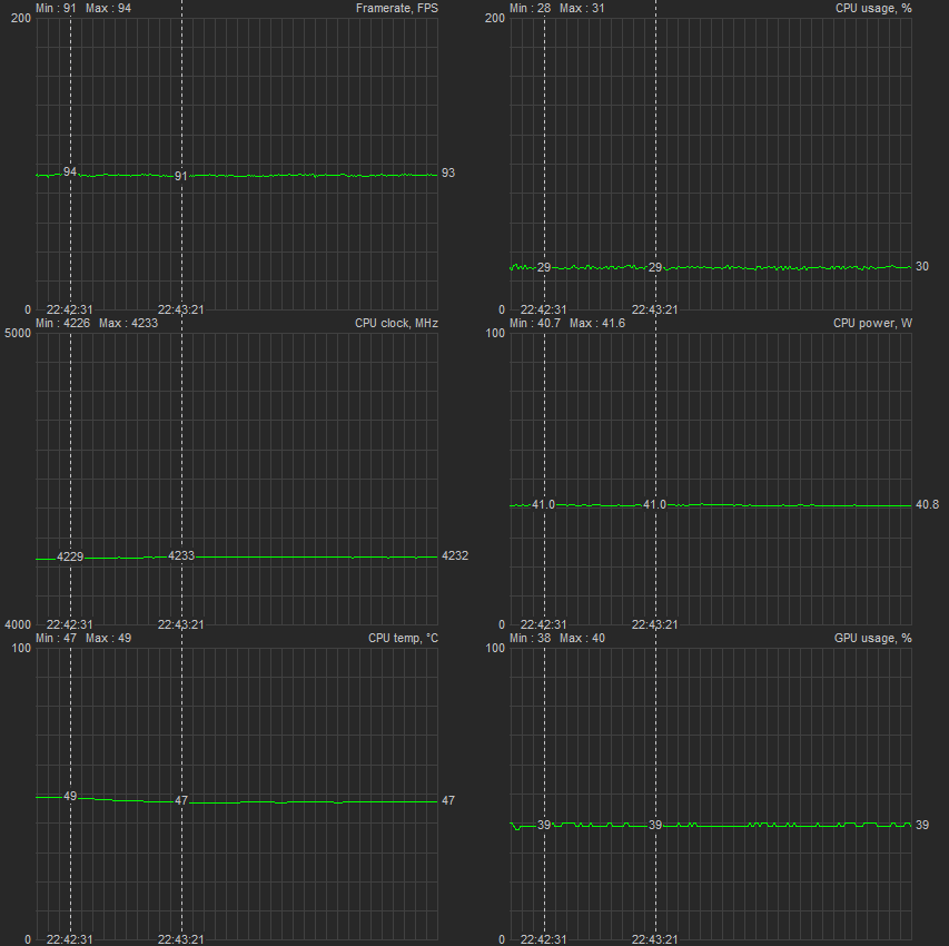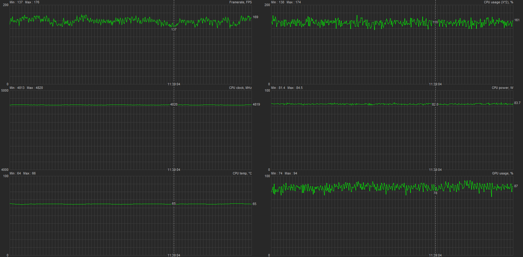 Настройки почти аналогичны тем, что я использую во время обычной игры. Ограничение кадров на всякий случай поднято с 200 до 300. Чтобы максимально загрузить процессор, включена настройка Future frame rendering. Посмотрите в таблице ниже на график GPU usage для конфигурации "5800x 8". Видите маленькие "полочки"? Это идёт упор в видеокарту, потому что с приведённым настройками игра больше, чем на 95%, её загрузить не может. Снижение разрешения с 1600x900 до 1280x720 повлияло на загрузку видеокарты на удивление слабо, поэтому снижать дальше не имеет смысла.