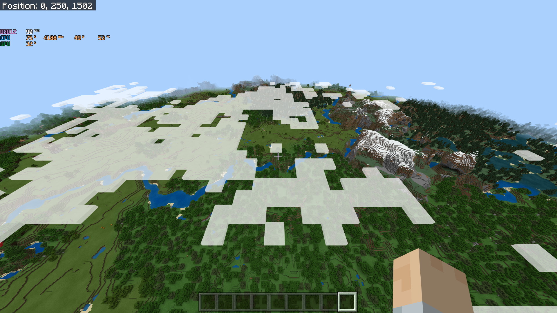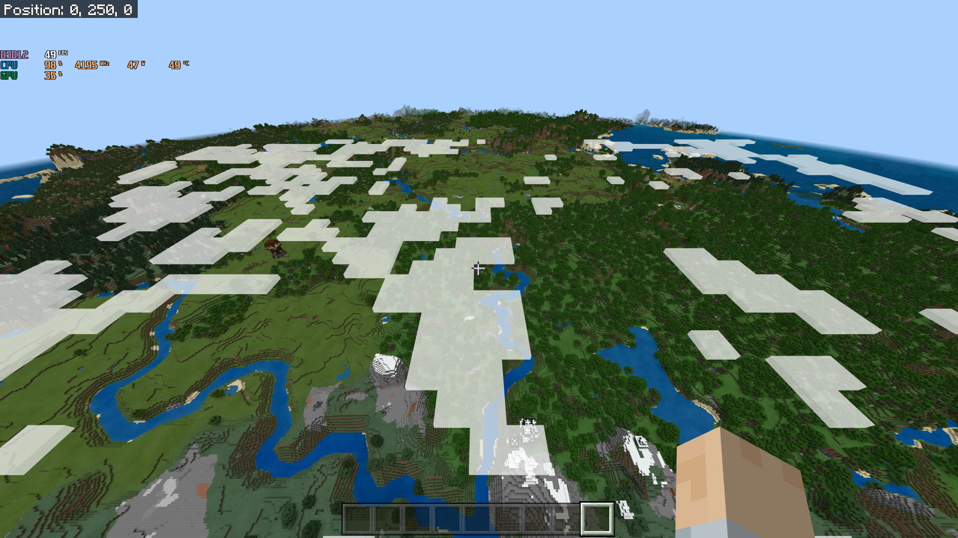 Второй тест проводится во время полета в "творческом" режиме на обычной скорости (без клавиши SHIFT) на расстояние 1500 блоков. Дальность прорисовки уменьшена до 48 (обычное значение), чтобы во время полёта игра успевала подгружать попадающие в поле зрения блоки.