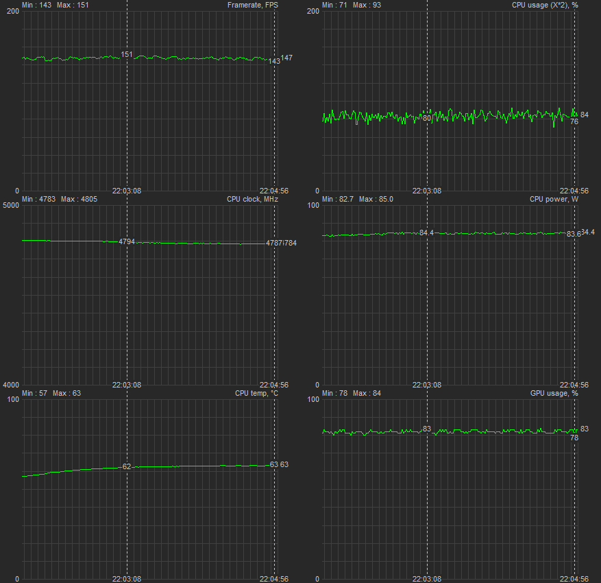 Для каждой конфигурации проводилось от 3 до 8 прогонов. Результат работы каждого прогона — частота кадров, измеренная RTSS, и графики MSI Afterburner. Что означают числа в таблицах: