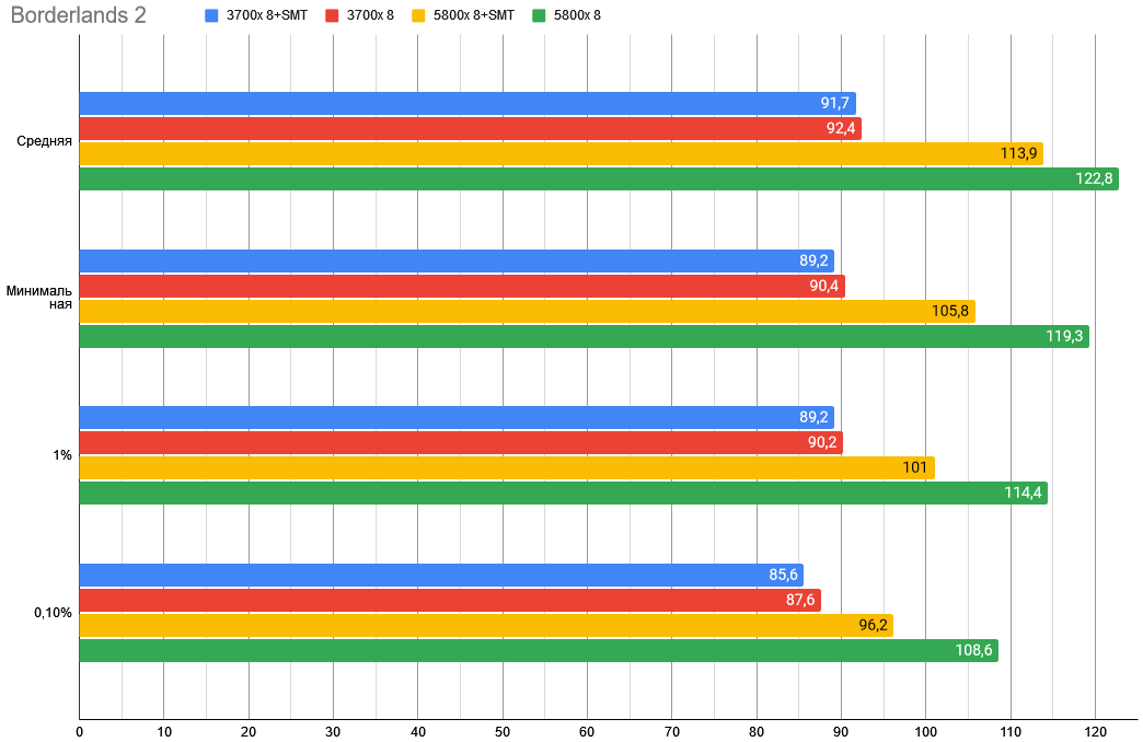 Для 5800x, вместе с отключением SMT-ядер были отключены 4 полноценных ядра командой start /affinity 505 borderlands2.exe. Как я писал выше, игра малопоточная, поэтому частота кадров даже увеличилась на символический 1 к/с (возможно, потому что винда меньше кидает потоки по разным ядрам). Но главное, это позволило немного снизить температуру процессора, по двум причинам.