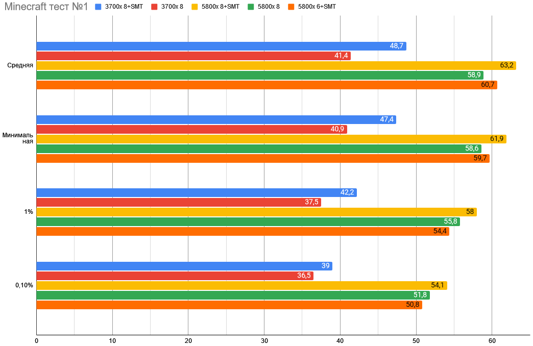 Хотел ещё замутить третий тест с замером времени начальной прогрузки карты (чанков), но оказалось, что оно не зависит от производительности процессора. Зато зависит от количество ядер: отключение SMT увеличивает время прогрузки в 2-3 раза! Можете сами убедиться, сравнив графики в первой таблице. Похоже на косяк игры (тестировал версию 1.17.11).