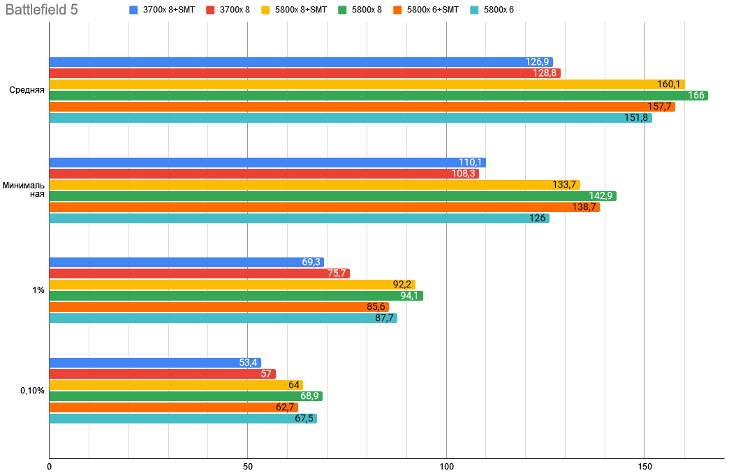 Несмотря на все усилия, погрешность измерения минимальной частоты кадров велика. Особо вопиющие случаи обведены красной рамкой. Даже у средней частоты есть проблемный результат, где погрешность в два раза выше разницы между двумя конфигурациями, то есть частота кадров у "5800x 8" в некоторых раундах снижалась до уровня "5800x 8+SMT".