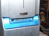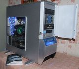 Даже передняя панель алюминиевая, а передняя дверца такой толщины, что, кажется, выдержит прямое попадание пули не самого маленького калибра! Дизайн корпуса…на любителя. Не каждому понравится нарочитая брутальность, угловатые формы, кому-то по душе мягкие обводы и закругленные края либо вообще строгость без излишеств. По мне же выглядит Аврора как типичный «хайтек», сразу выдавая своим видом принадлежность к семейству недешевых вместилищ для недешевых комплектующих. В оформлении передней части инженерам Gigabyte удалось совместить некоторые модные и бесполезные примочки (вроде надписи, которая проецируется на пол при работе компьютера) с функциональностью. Скажите мне, зачем нужны передние дверцы на корпусах? Неужели только для красоты, чтобы внешний вид компьютера был более гармоничным? У многих дешевых корпусов так и есть, но не в данном случае. Дверца, как оказалось, неплохо снижает уровень шума от работающего DVD-привода, а именно гасит высокочастотные звуки при раскручивании диска в приводе. За дверцей скрываются 5 отсеков 5.25``, 2 внешних 3.5-дюймовых отсека, подсвеченная синим кнопка запуска, и полноразмерный Reset (а то ишь вздумали некоторые без Reset`а делать!!!). В закрытом положении дверца удерживается магнитом и может закрываться ключом (хорошо, что есть в комплекте