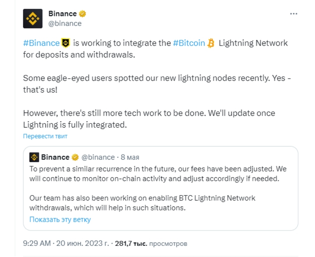 Изначально об этой инициативе Binance было объявлено 8 мая, когда сеть биткоина испытывала перегрузку из-за создания ординалов. Несколько конкурирующих бирж, включая Kraken и Bitfinex, уже интегрировали сеть второго уровня, известную как Lightning Network. Она предназначена для снижения затрат и увеличения пропускной способности транзакций в сети биткоина.