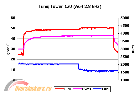 Для начала результаты, показанные кулером Tuniq Tower 120. Графики температур строились по левой оси, а скорость вращения вентилятора отложена по правой.